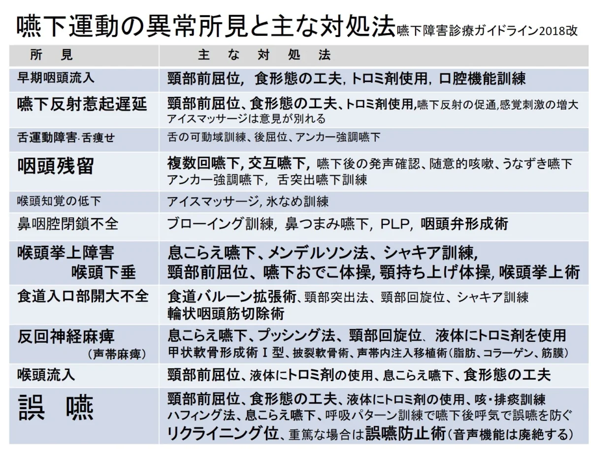窒息事故を起こし易い食べ物を避けます。具体的には『餅、パン、お握り、寿司、肉片(鳥唐揚げ、ステーキ)、団子、コンニャク、里芋、りんご、パイナップル』などは避けます。食事中の姿勢や、一口量を少な目に調整するなどの嚥下指導※5・6)で、誤嚥をある程度は減少させることができます。