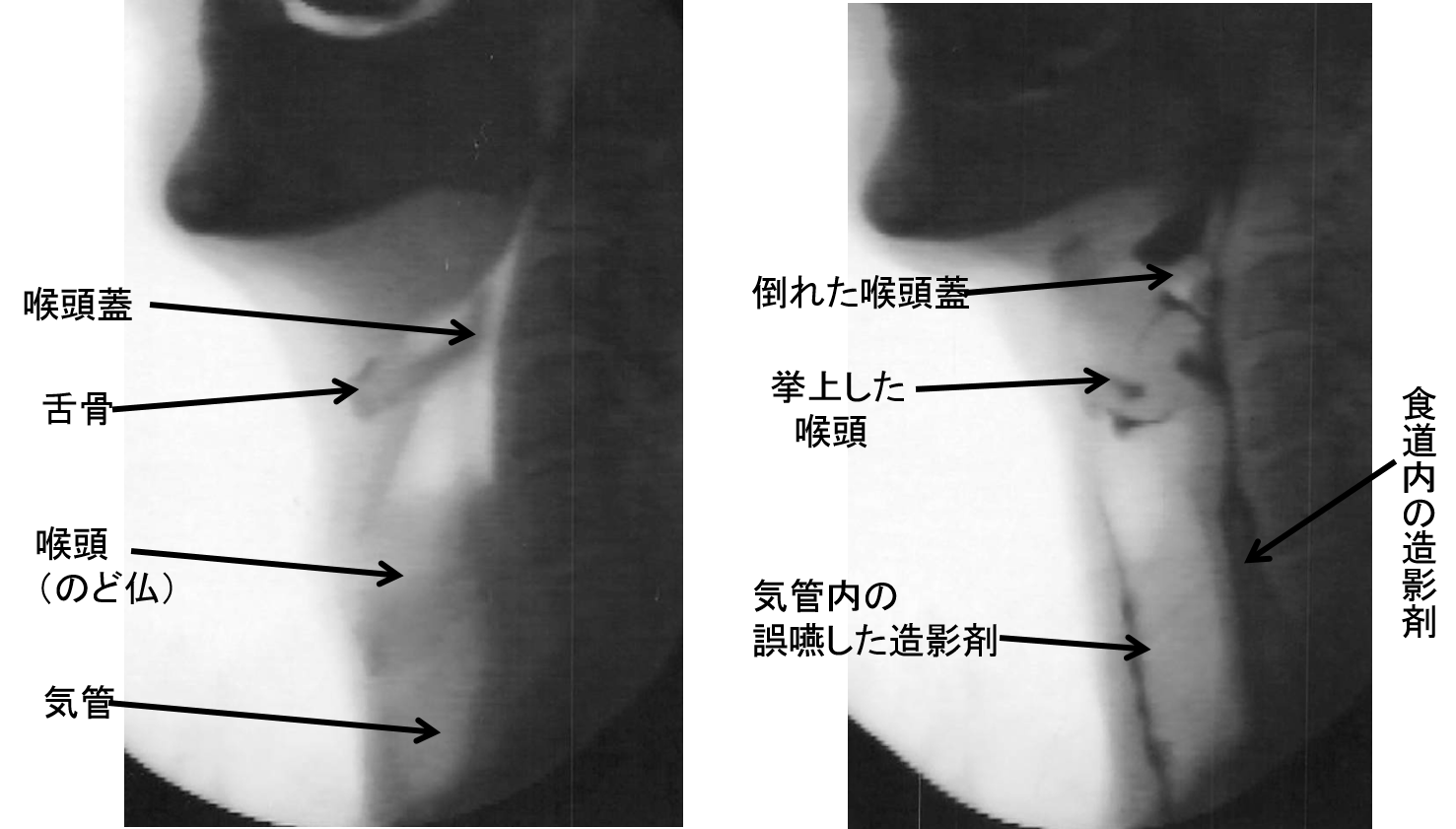 “水”に代表される液体は、咽頭を通過する時間が早いので一番誤嚥を起こし易いです。嚥下機能が低下すると食物等が誤嚥して肺に入り、嚥下性肺炎を発症します。寝ている間に口腔内の唾液を誤嚥する場合や、胃の内容物が逆流して誤嚥して肺炎を発症する場合もあります。餅(もち)を代表とする食べにくい食物を詰まらせる問題(窒息事故)も生じます。認知症があると口腔内に貯め込みや丸呑みをするので、誤嚥や窒息を起し易くなります。