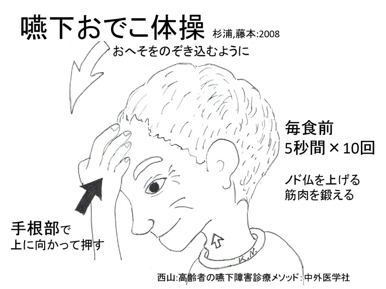 テレビを付けながらの“ながら食い”は止めて、食事に集中して食べるようにします。意識して唾液を飲み込む訓練や、飲み込む時に“軽く下を向いて”飲む、“頸部を前屈”させる(顎を引いてはいけない。下部頚椎から曲げるのが正しい)、飲み込んだ後に息を吐いたり、咳払いをして誤嚥した物を出す訓練をします。喉仏を上げる筋肉を鍛えます。イラストの嚥下おでこ体操や、顎持ち上げ体操を行います。さらに喉の機能だけを鍛えるのではなく、呼吸機能や全身を鍛えることも誤嚥性肺炎の予防になります。
