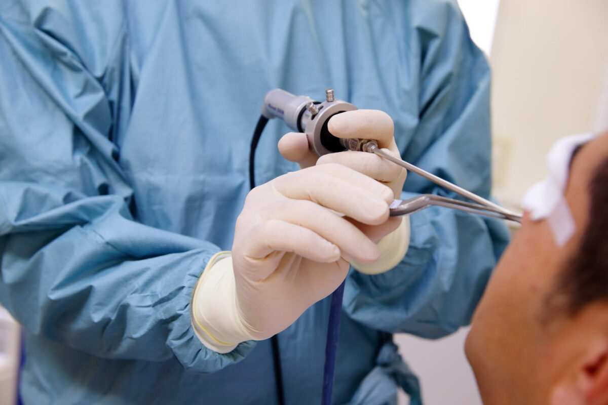 手術が必要とされるのは、薬の治療で効果が見られない場合や、鼻茸が見られる場合です。内視鏡下副鼻腔手術では、細い内視鏡を鼻腔に挿入して鼻茸の切除や患部を処置します。他に、経上顎洞的副鼻腔手術という上の唇と歯茎の間を切り開いて中にある粘膜を取り除く手術もありますが、内視鏡手術は痛みや腫れが大幅に抑えられますし、回復も早いため近年ではほとんどが内視鏡手術となっています。手術所要時間は30分~2時間程度であり、ほとんどの場合、日帰りで受けることができます。鼻茸は一度できてしまうと手術で切除しても必ず再発します。